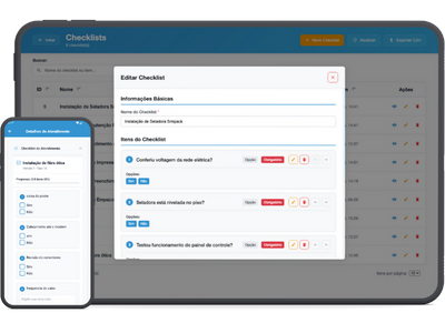 O técnico acessa o app com todos os detalhes do atendimento. Consulta histórico, preenche checklists personalizados, registra fotos e coleta assinatura digital. Temporizadores automáticos e geolocalização garantem rastreabilidade.