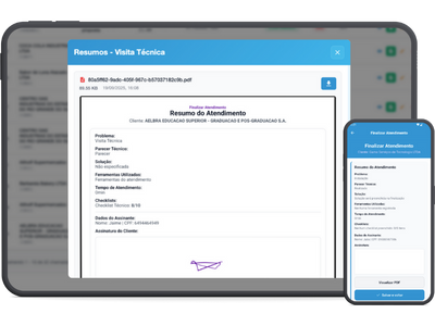 Após o atendimento, o técnico fecha o chamado com base no resumo da visita. Peças utilizadas, tempos de serviço e anexos são consolidados. O cliente valida tudo com assinatura eletrônica.