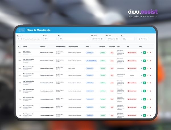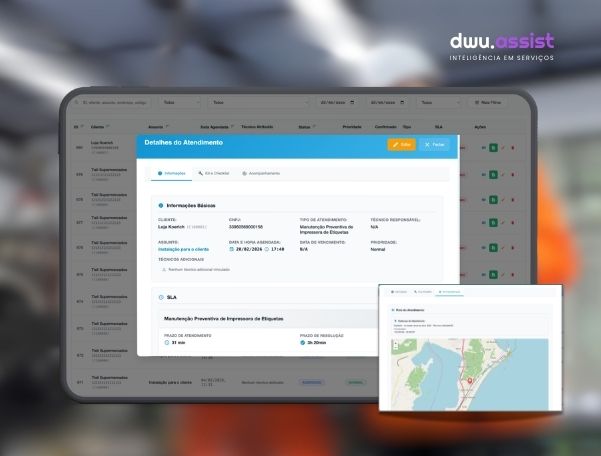 O DWU Assist é uma solução completa para gestão de serviços técnicos, construída para trabalhar integrada ao SAP Business One. Com ele, você organiza toda a sua operação, desde o momento em que um atendimento é planejado até a assinatura digital do cliente ao final da visita.