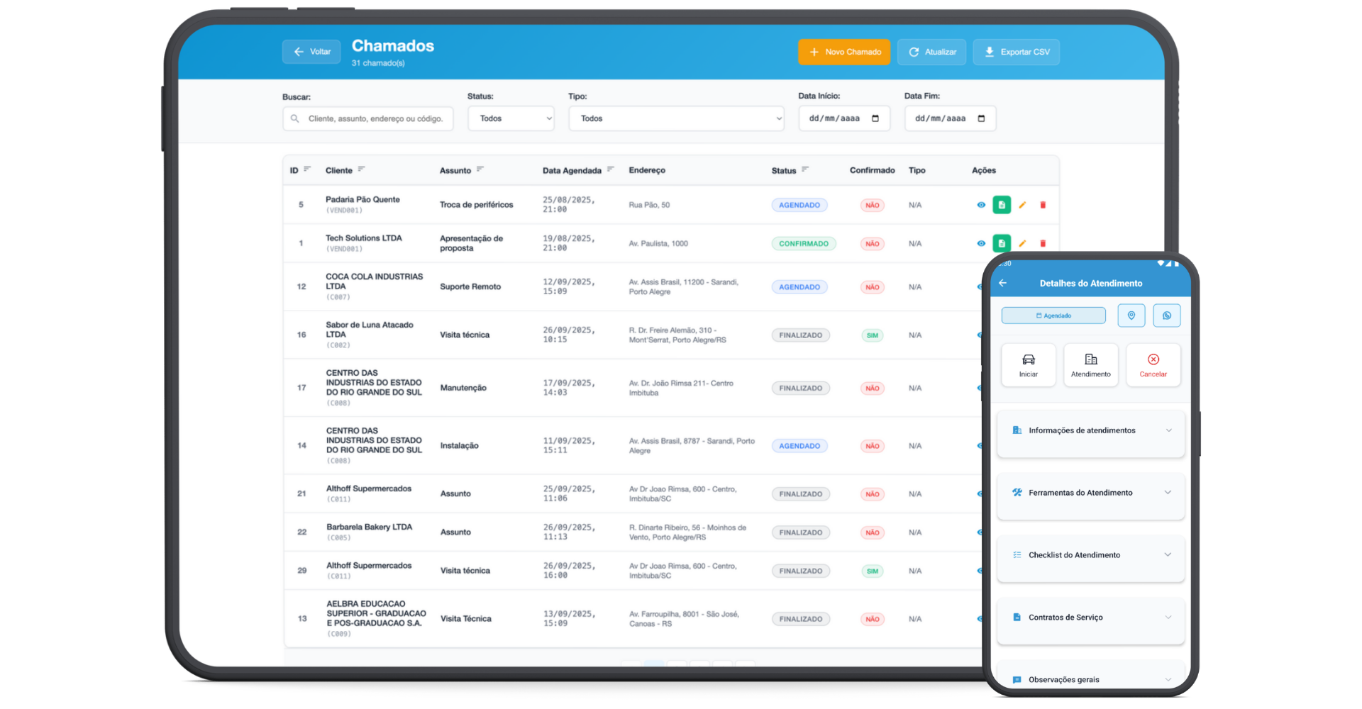 O aplicativo do técnico está disponível para Android e iOS. Por ele, o técnico recebe os chamados validados, registra o deslocamento e a chegada, executa o checklist, tira fotos e registra evidências, aponta os materiais consumidos e coleta a assinatura digital do cliente ao final do atendimento. Tudo sincronizado em tempo real com o sistema e integrado ao SAP.